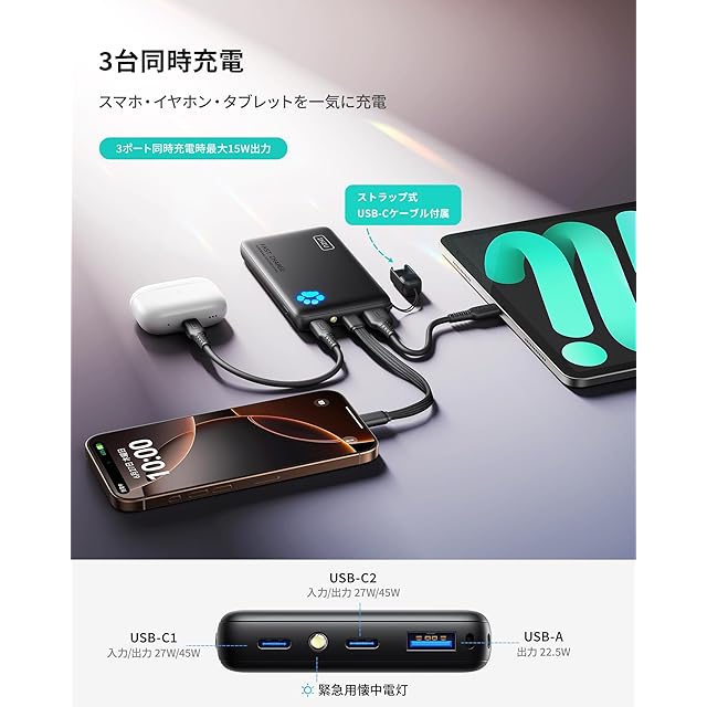 【3台同時充電】2つのUSB-Cポートと1つのUSB-Aポートを搭載し、緊急時に3台のデバイスを同時に充電できます。