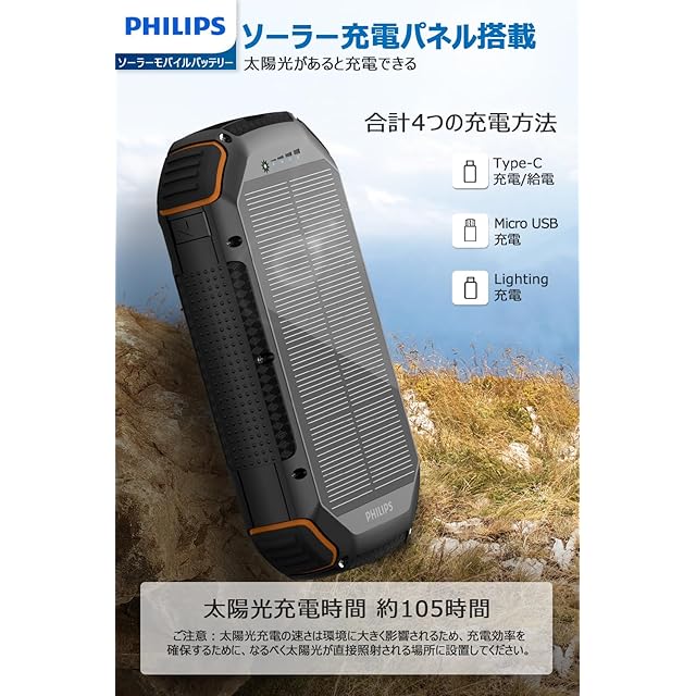 商品名:Philips(フィリップス)【ソーラー モバイルバッテリー 20000mAh】ソーラー充電器 ソーラーチャージャー 4way蓄電 大容量充電器 5ポート 入出力兼用/急速充電/高輝度 LED/SOSライト付き 耐衝撃 旅行/キャンプ/災害/非常用グッズ ios/Android 対応 PSE認証済 DLP7726N (ブラック)