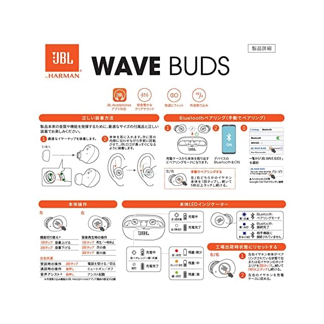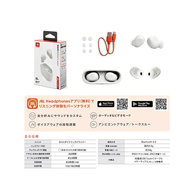 商品名:JBL WAVE BUDS 完全ワイヤレスイヤホン Bluetooth/IP54防水防塵/アプリ対応USBタイプC/ホワイト JBLWBUDSWHT 小