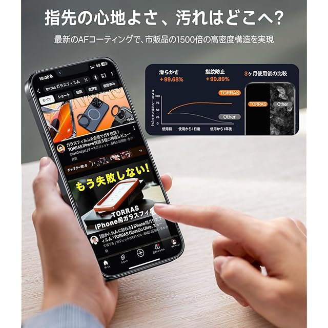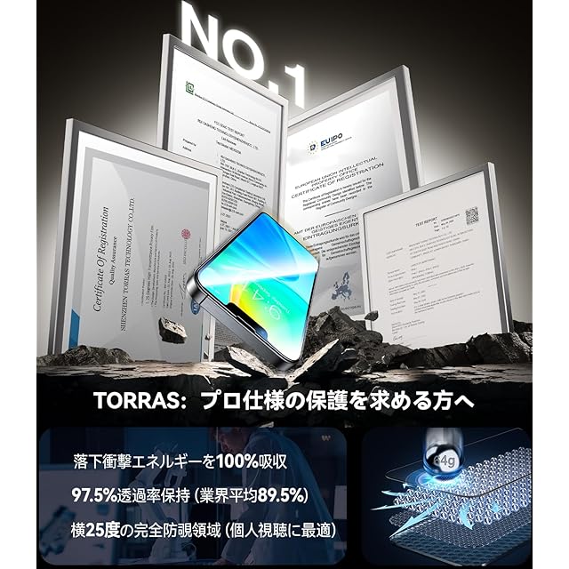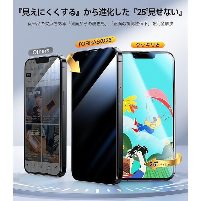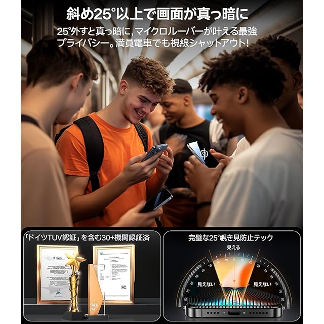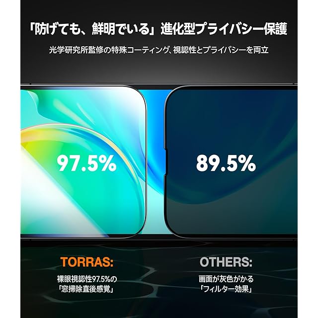 【のぞき見をシャットアウト 自分だけの画面に。高画质を楽しむ】iPhone 16/15の画面、知らないうちに誰かに覗かれていない?TORRAS独自の25°マイクロルーバー技術で、のぞき見を「見えにくくする」から「見せない」へ進化。電車の中、ラーメン店、居酒屋、そして夜の賑わう店内でも——あらゆる「視線が気になるシーン」で、安心してスマホ操作が可能に。特にプライバシーを大切にしたい方、仕事で重要情報を扱う方には心強い味方である。30以上の国際認証(ドイツTÜVを含む)を取得し、安全性と信頼性はお墨付き。守りたい情報を、確実に守る。 それがTORRASのプライバシーフィルムである。さらに光学研究所監修の特殊コーティングにより、画面透過率97.5%を実現し、裸眼でも鮮やかで自然な色味を保つ。市販品に見られるような灰色フィルター感は一切なく、動画もゲームもメッセージも、ストレスなく高画質でお楽しみいただけます。