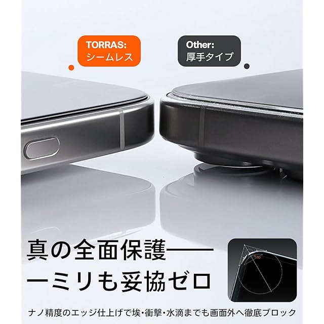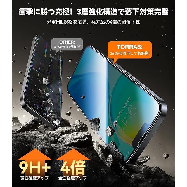 【世界が認めたDragontrailガラスで、画面を鉄壁に】使用されているのは、日本製AGC社「Dragontrail」ガラス。航空宇宙でも使われる技術を応用し、9Hを超えるHv673の硬度を実現。耐衝撃性は市販品の約3倍、日常の落下や摩擦から画面をしっかり守ります。世界30カ国で9600万枚を突破、“画面破損ゼロ”の信頼性。TORRAS iPhone 16/15用のケースとの併用で、まさに鉄壁の防御力を。