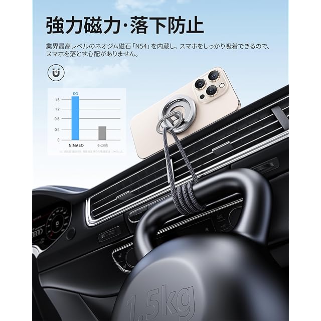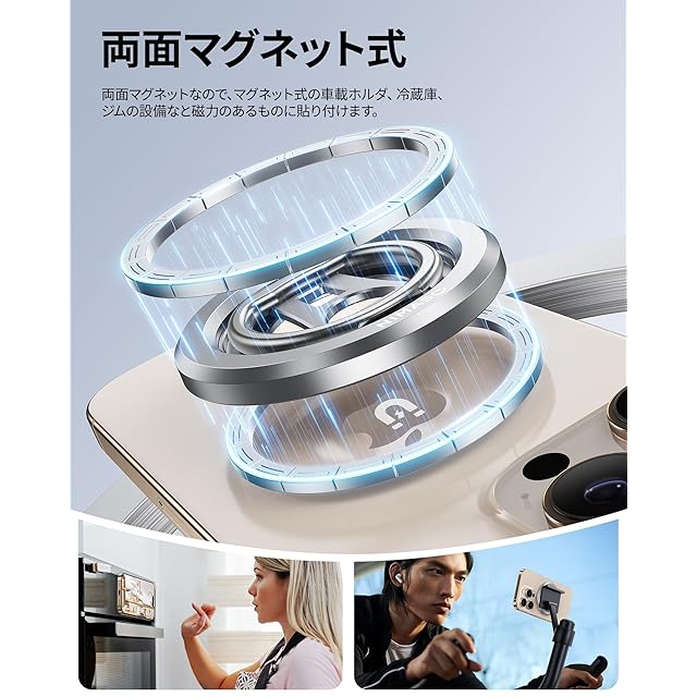 【超強力ネオジム磁石内蔵】業界最高レベルのネオジム磁石「N54」を内蔵し、最大磁気吸引力はなんと1500g。スマホをしっかり吸着できるので、スマホを落とす心配がありません。 マグネット式スマホリングで、iPhone MagSafe 対応シリーズ本体やMagSafe搭載ケースに簡単に装着できます。 また、マグネットなので跡を残さず取り外し可能です。