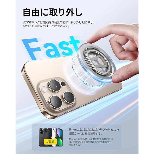 【全機種対応!メタルリング付き】iPhone 16、16Plus、16Pro、16Pro Max、iPhone 15、15Plus、15Pro、15Pro Max, iPhone 14、 14pro、 14pro max,、14Plus, iPhone 13、13 Pro、 13 Pro Max、13 mini, iphone 12、 12 Pro、12 Pro Max、12 miniやMagSafe搭載ケースの場合、直接装着可能です。付属されたメタルリングを利用すれば、磁力がより強くなります。 iPhone 11/iPhone X /iPhone 8/ SEまたはSony Xperia、SHARP AQUOS、Samsung GalaxyなどMagSafe機能のないスマホや非対応ケースをお使いの場合、付属のメタルリングを貼れば簡単に使用することもできます。