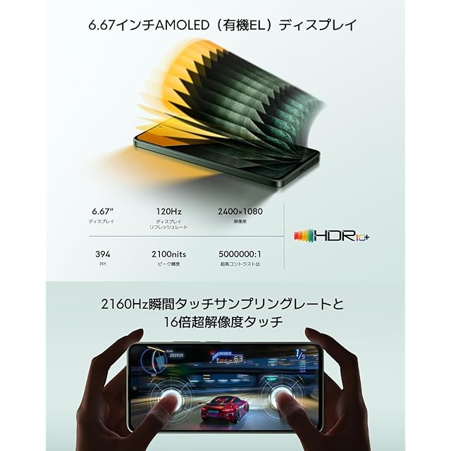 【なめらかで鮮やかな有機EL(AMOLED)ディスプレイ】120Hzのリフレッシュレートに対応したFHD+解像度(2400 x 1080)のなめらかで高精細な6.67インチ有機EL(AMOLED)ディスプレイを搭載。Corning Gorilla Glass 5を採用した堅牢な画面は触るだけで素早く指紋認証します。