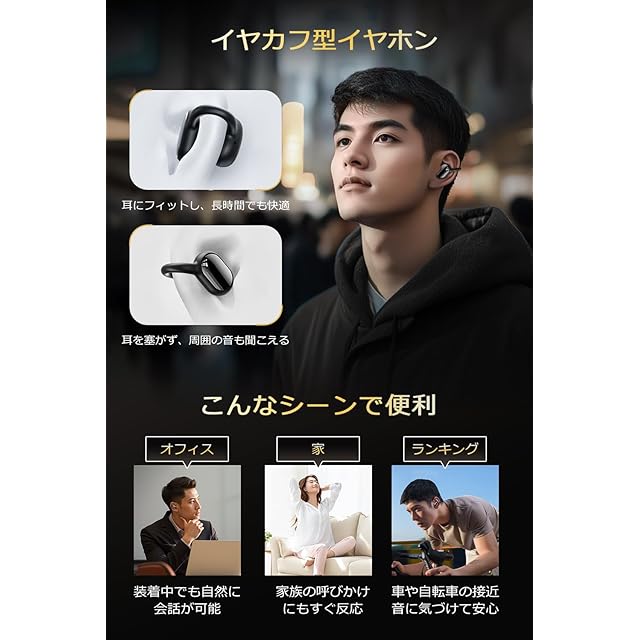 【IPX7防水&タッチ操作でどんなシーンでも快適】IPX7防水仕様により、汗や小雨でも安心。ランニング、通勤・通学、ジムなどのシーンでも使用できるタフな設計。さらに直感的なタッチ操作で、音楽再生・曲送り・音量調整・通話応答・音声アシスタント起動まで簡単操作。イヤーカフイヤホンとしてのフィット感と、耳を塞がないイヤホンの開放感を兼ね備え、仕事にもプライベートにもぴったりな完全 bluetooth イヤホンです。