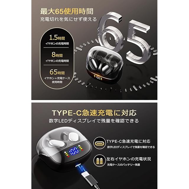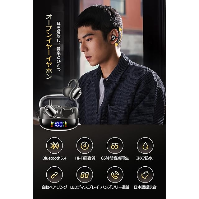 商品名:イヤホン bluetooth ワイヤレスイヤホン 【2025新開発 骨伝導の進化 オープンイヤーイヤフォン】 Bluetooth5.4+ EDR 耳挟み型 耳を塞がないイヤホン LEDディスプレイ残量表示 65時間連続再生 Hi-Fi AAC/SBCに対応 通話ノイズキャンセリング ブルートゥースイヤホン 自動ペアリング ハンズフリー通話 Type-C急速充電 IPX7防水 通勤/通学