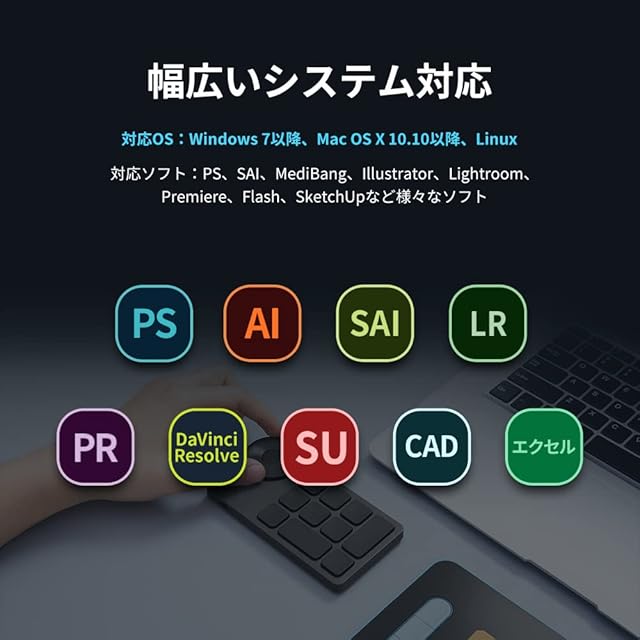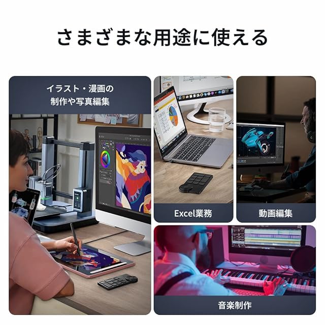 【複数デバイス間でも使用簡単】ドライバの設定内容をACK05本体に保存することで、複数デバイス間における設定共有が容易になり、繰り返し設定を行う必要がなく、創作がより便利になります。※有線接続のみ対応。※同じOSのみ対応。例えば、Windows版ドライバからエクスポートした場合、Windowsのみにインポート可能【高い互換性】対応OS:Windows 7以降、macOS 10.10以降、Linux。【接続方式】①Bluetoothでパソコンと接続。②付属USBレシーバーでパソコンと接続。③付属ケーブルでパソコンと接続。※Bluetooth接続は、すべてのBluetoothアダプターに対応することをするものではありません。