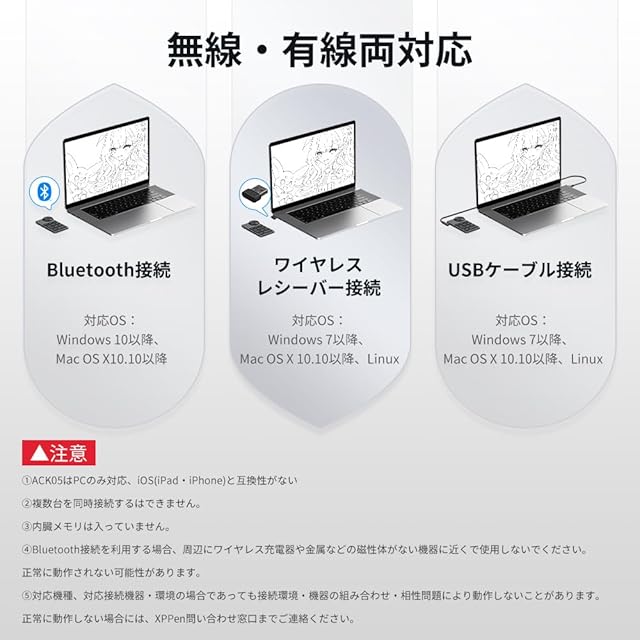 【ご注意】1.ACK05左手デバイスはPCのみ対応、iOS(iPad・iPhone)と互換性がない。2.Bluetooth接続を利用する場合、周辺にワイヤレス充電器や金属などの磁性体がない機器に近くで使用しないでください。正常に動作されない可能性があります。3.複数台を同時接続するはできません。4.内臓メモリは入っていません。5.カスタム設定を維持するには、ドライバーを常に起動状態に保つ必要がございます。ドライバーソフトウェアを終了された場合、設定は保持されませんのでご注意ください。6.最新版のドライバをダウンロード・使用してください。7.使用しているOSが最新の状態にアップデートされているかをご確認ください。8.対応機種、対応接続機器・環境の場合であっても接続環境・機器の組み合わせ・相性問題により動作しないことがあります。何かご不明な点がございましたら、XPPen公式サポートまでお問い合わせください。