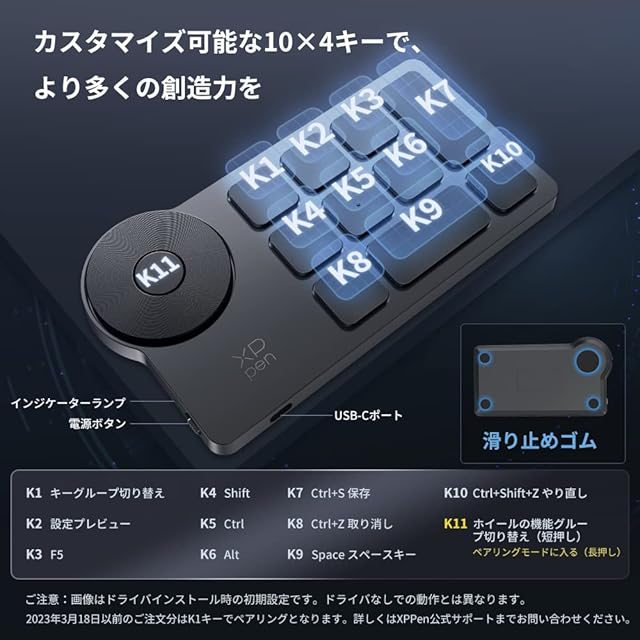【ご注意】*ACK05左手デバイスはPCのみ対応、iOS(iPad・iPhone)と互換性がない。*Bluetooth接続を利用する場合、周辺にワイヤレス充電器や金属などの磁性体がない機器に近くで使用しないでください。正常に動作されない可能性があります。*複数台を同時接続するはできません。*内臓メモリは入っていません。*Bluetooth接続は、すべてのBluetoothアダプターに対応することをするものではありません。*最新版のドライバをダウンロード・使用してください。*カスタム設定を維持するには、ドライバーを常に起動状態に保つ必要がございます。ドライバーソフトウェアを終了された場合、設定は保持されませんのでご注意ください。●対応機種、対応接続機器・環境の場合であっても接続環境・機器の組み合わせ・相性問題により動作しないことがあります。何かご不明な点がございましたら、XPPen公式サポートまでお問い合わせください。