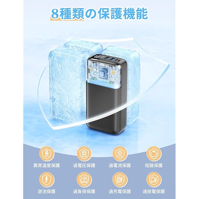 【安全性を追求した多重保護システム・PSE安全マーク取得済み】お客様に安心・安全にご使用いただけるよう、本製品には燃えにくい難燃性の高い素材を採用。さらに、電池と筐体の間に十分なスペースを確保し、バッテリーへの負担を軽減する設計を施しました。独自の保護機能パッケージにより、過熱・過充電・過放電・過電流・過電圧防止機能、短絡保護機能、逆流防止・過負荷保護など8つの安全機能を搭載。万が一ショートが発生した際も、自動的に充電を停止するため、安心してご利用いただけます。さらに、PSE安全マーク取得済みで、大容量ながら安全性を最優先した設計となっており、信頼できる一台です。モバイルバッテリー 急速充電対応で、防災グッズとしても多くのユーザーに選ばれています。63800mAhという圧倒的な容量で、モバイルバッテリー 大容量をお探しの方にはまさに理想の選択です。【パッケージ内容】63800mAhバッテリー本体×1、Type-Cケーブル×1、日本語取扱説明書×1