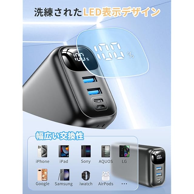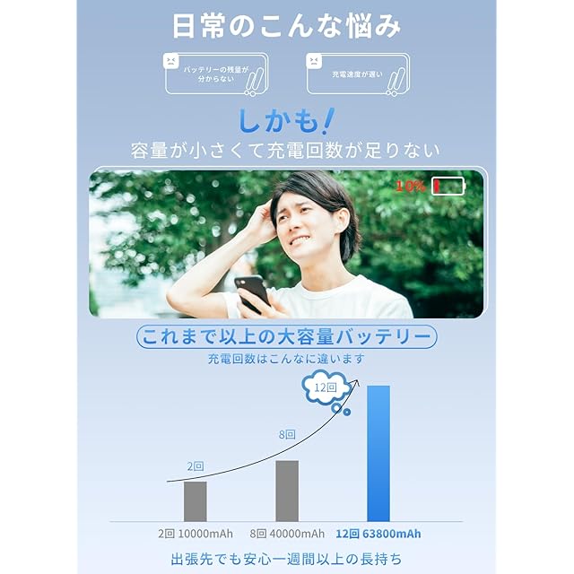 【2025年新登場・待望の大容量モデル】業界でもトップクラスの人気と実用性を誇る、弊社待望の新作63800mAh大容量モバイルバッテリー「P5」がついに登場!⚡急速充電と超長時間の待機が本製品の最大の特長で、日常生活で大活躍すること間違いなし。1000回以上の充電サイクルを誇る長寿命と高い安全性を実現したリチウムイオン電池を採用し、Power Delivery認証に対応したスマートフォンやタブレットを超高速で充電可能。旅行先では家族とシェアしたり、出張中に仕事用・プライベート用の端末を同時に充電できる頼もしい容量です。ポケットやリュックにすっぽり収まるコンパクトサイズで、出張や旅行などの短期間の外出はもちろん、台風や地震などの災害時の緊急電源としても大いに役立ちます。モバイルバッテリー コンパクトタイプながら、防災グッズとしても人気の一台です。