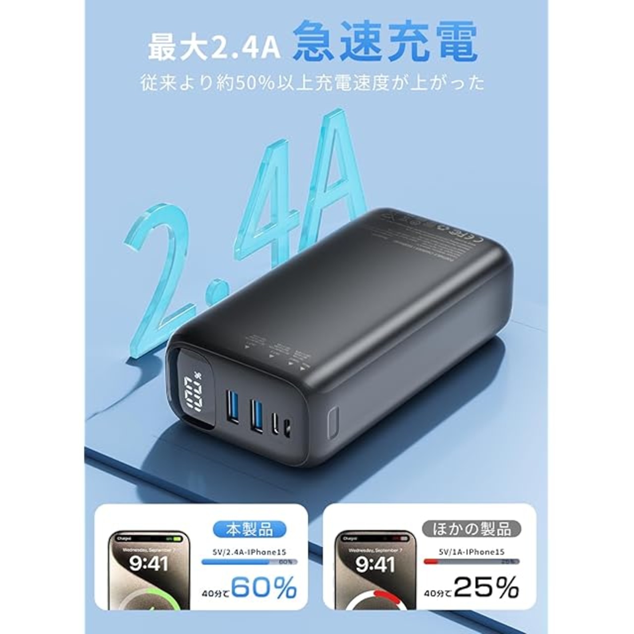 商品名:モバイルバッテリー 大容量 【63800mAh 3台同時充電可能】 モバイルバッテリー 最大2.4A出力 急速充電 LEDディスプレイ残量表示 おまかせ充電 スマホ充電器 携帯充電器 軽量 持ち運び便利 PSE技術認証済 安全回路保護 アウトドア/旅行/出張/停電対策/防災 日本語説明書
