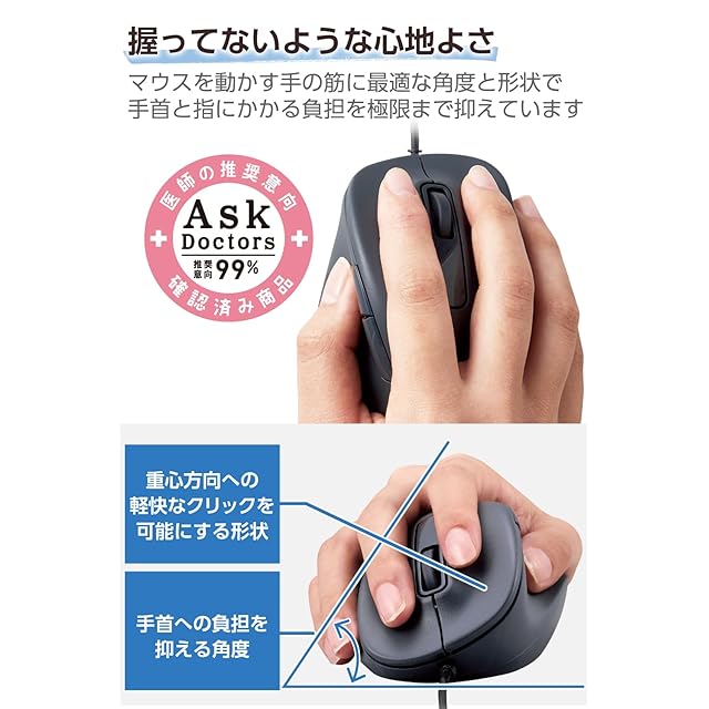 整形外科医との共同開発により自然な手の形のまま使える、握らないマウス“EX-G"シリーズ。手首と指を動かす筋に着目し、マウスを動かす際にかかる身体の負担を極限まで抑えた有線5ボタンマウスです。