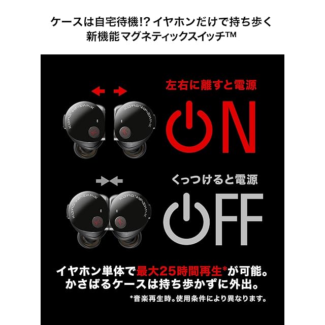 ケースは自宅待機、イヤホンだけで使える「マグネティックスイッチ 」機 能:イヤホンを取り出して左右に離すと電源ON 、マグネットでくっつけると電源OFFできる機能を搭載しました。これまでの完全ワイヤレスイヤホンで感じる「充電ケースに入れないと電池切れ が心配」「毎回ケースから取り出すのが面倒」といったストレスから解放され、使いたいときにすぐ使えます。