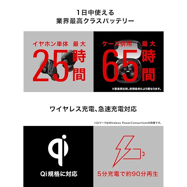 1日中使える、業界最高クラスバッテリー:ノイズキャンセリングOFF時では、イヤホンだけで最大25時間の連続再生が可能なため、 電池切れを心配することなく音楽や動画やSNSを1日中楽しむことができます。また、ノイズキャンセリングON時でも最大15時間、充電ケースを併用すれば最大65時間の連続再生が可能です。