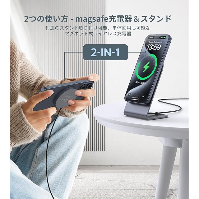 【ワイヤレス充電パッドとマグセーフ充電スタンドを切り替えられる】付属のスタンドは、同梱のmagsafe充電器を取り付け・取り外し可能です。取り付けるとマグネット式スタンドとして使用でき、強力な磁力でしっかり吸着し、落下の心配がありません。自宅・オフィス・テレワークに最適です。取り外せば充電パッドとして単体で使え、ピタッと正確に吸着するため、ズレなく高効率に充電できます。