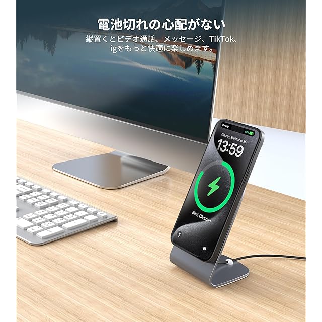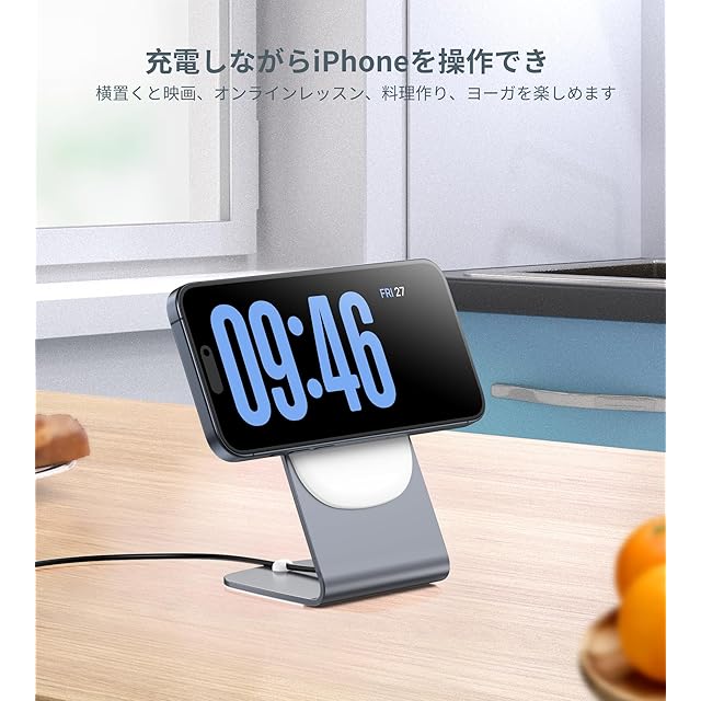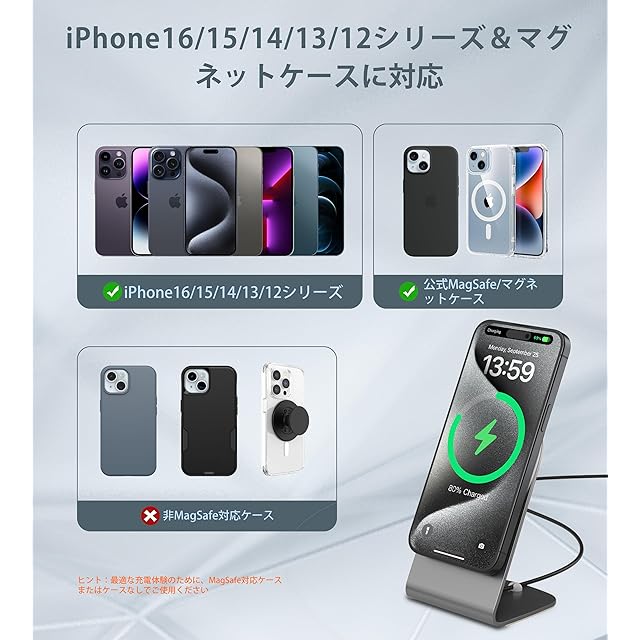 【優れた安全保護・効率的に急速充電】iPhone16/15 /14/13/12を0から100%まで2〜3時間で充電できます。アップル社のワイヤレス充電器とほぼ同じな時間がかかります。インテリジェントETL認定チップの安全保護システムは、過充電、過電流、過電圧、過熱、およびショートを防止します。アルミニウム合金の金属本体で、急速充電中にも熱を迅速に発散できます。