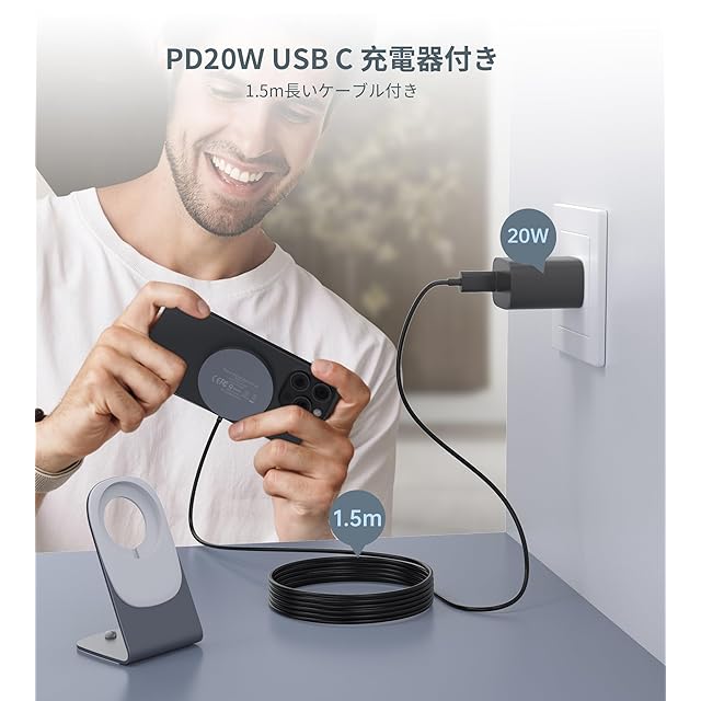 【MagSafe充電器+ 20W PD USB-C充電器+MagSafe充電スタンド】 人気のMagSafe対応ワイヤレス充電器、専用スタンド、PD 20W USB-Cアダプターの3点セットです。iPhone 12〜16シリーズにピタッとくっついて、安定して充電できます。※ご注意:①付属のアダプターは有線急速充電にも対応。②スタンドは同梱のmagsafe充電パッド専用です。③ケースを付けたままご使用になる場合は、MagSafe対応のマグネット付きケースをご使用ください。④3mm以上の厚さの携帯電話ケースや金属物(鍵、クレジットカード、金属製の携帯電話ケース、金属リング)を充電器と充電デバイスの間に置かないでください。磁石のないケースには対応しておりません。