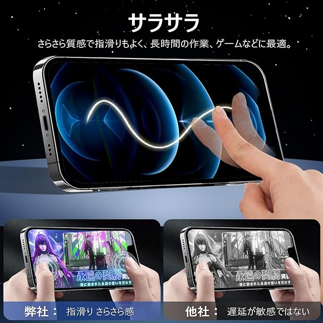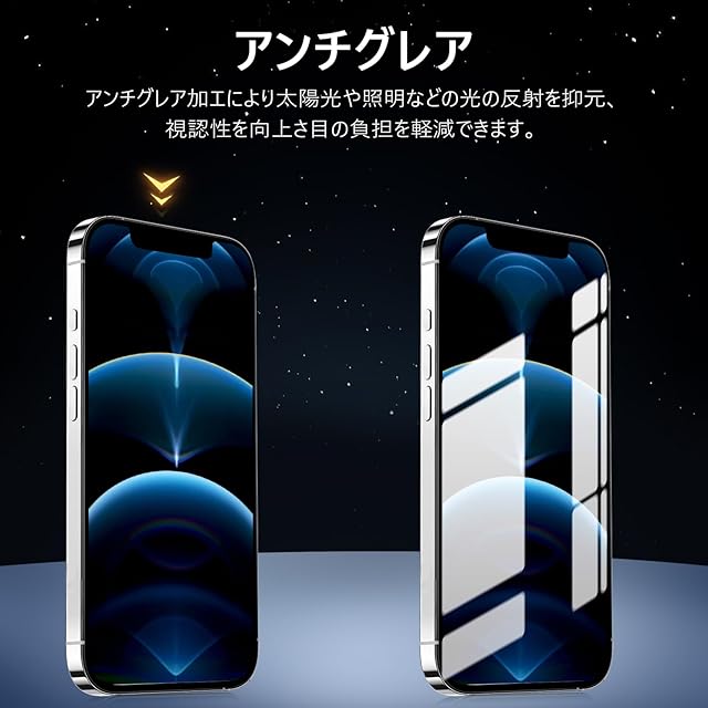 【アンチグレア・指紋防止・高感度タッチ】 アンチグレア(非光沢)タイプのさらさらで快適な操作感。光の反射を軽減し、より目に優しくちらつきを抑えます。同時に、iPhone12プロマックス ガラスフィルムには撥油コーティングが施されており、指紋や汚れなどに強くなめらかな操作感を実現、付着した汚れなどは簡単に拭きとれます。こちらは高耐久撥油コーティングが施され、つるつるな滑り感を実現!ゲームをする人におすすめです。