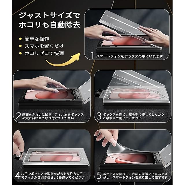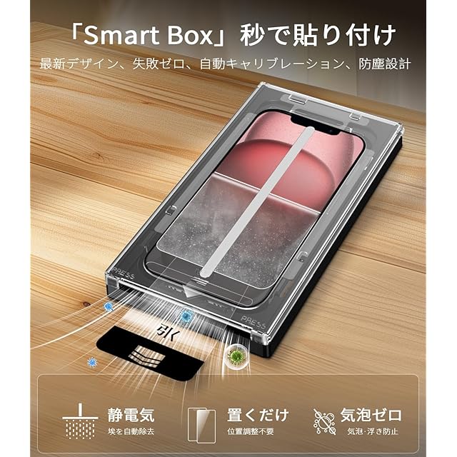 【最新なフィルム貼り付けデザイン・2ステップで簡単に貼り付け】MINIKA いPhone15 Plus ガラスフィルム の画期的なバリ楽BOX。このボックスには自動位置決め機能を搭載し、埃や気泡が埃除去フィルムを剥がした直後に即座に排出されます。いPhone15プラスをボックスに入れ、iPhone15プラス フィルム をフレームにセットし、ガイドテープを引き出すだけで、素早くずれずに取り付け可能です。