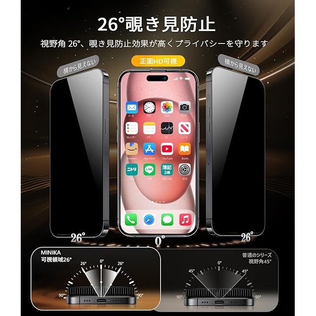【覗き見防止・プライバシーを常に守る】iPhone15Plusの覗き見防止フィルター、左右180度(前から约26度の視角)のぞき見防止。正面から見た場合、クリアで画質が高い。側方から見た場合 、画面が徐々に暗くなる。外出や仕事などの活動を制限せずにアイフォンをお楽しみいただけます。