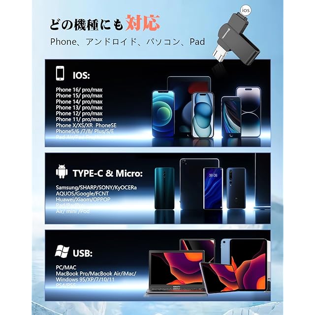 【最新4in1設計】/USB-C/USB3.0/MicroUSBの4in1端子を搭載。16Pro Max/16シリーズはもちろん、最新MacBook Pro(M3チップ搭載)まで幅広く対応。usbメモリ タイプc端子はUSB3.0 Gen1規格で最大転送速度を実現。 usbメモリ phone対応はPhone16/15/ 14 /13/12 /SE /11/XR/XS Max/XS /X /8 Plus/8/Pad Air(第1/2/3世代)/ MacBook(Pro/Air)/pad mini(第1/2/3/4/5世代)/Pad(第5/6/7/8/9世代)アイフォン全シリーズ/ パソコン/ Type-Cスマホ/ Androidスマホ /タブレットなどとデータ移行 互換性のあるusbメモリ。