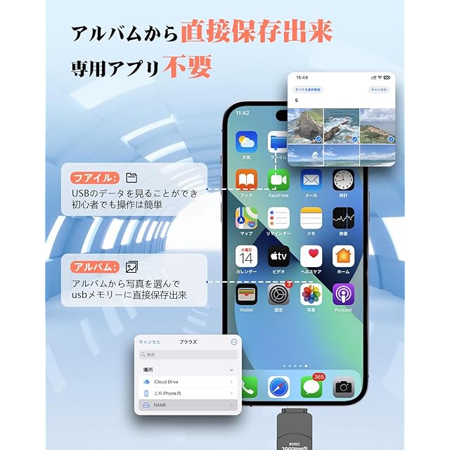 【完全アプリ不要の直感操作】対応USBメモリ256GBは完全アプリ不要設計。アルバムを開いて写真/動画を選択するだけ!3ステップ(選択→タップ→保存)でから直接usbに写真を移す可能。端子を挿すだけで外付けメモリ 自動認識、機械操作が苦手な方でも迷わず使えます。