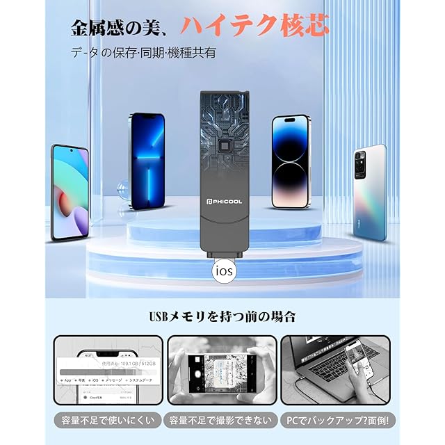 PHICOOL 4in1 USBメモリ 256GB【完全アプリ不要】から直接保存 外付けストレージ ▼3秒で始まるスマート生活 phoneのアルバムを開く→保存したい写真を選択→「USBへ転送」をタップ。 これだけで瞬時にデータ保存!クラウドサービスの月額費もWi-Fi環境も不要。 ▼2024年最新モデル完全対応 └ 16 Pro Max/16シリーズ~ 8まで全世代対応 └pad Pro(M2チップ搭載機種)/MacBook Air 15インチ等最新端末でも安定動作 └Type-C××USB3.0×MicroUSBの4WAY接続 ▼PHICOOLだけの5大革新 軍事級保護:航空アルミニウム合金ケース+内部緩衝材で2m落下耐性 超直感設計:カラー図解マニュアル+動画サポート(日本語専任スタッフ常駐) 潔癖症対応:抗菌加工ライトニングキャップ(99.9%菌繁殖抑制) 完全静音:無駄なLEDランプ廃止で会議中も安心使用 和風美学:桜模様刻印の収納ポーチ付属 ▼こんな方に必需品 ✓「Cloudの課金を解約したい」 ✓「孫の動画でスマホがパンク寸前」 ✓「機種変更時のデータ移行が面倒」 ✓「ビジネスデータの物理バックアップが必要」 ▼仕様詳細 ・転送速度:HD動画1GB約12秒 ・対応形式:HEIC/RAW/MP4/PDF等37種 ・動作環境:-20℃~60℃(雪山旅行でも問題なし) ・サイズ:親指サイズ(5.8×1.4cm) ・重量:ストラップ付きでも3.5g