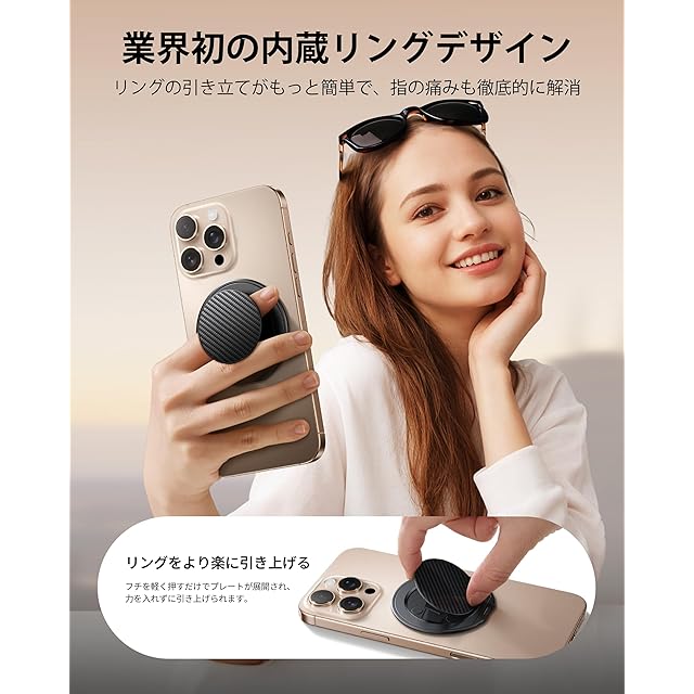 【業界初の内蔵リング - もっと快適な使い方】市販のスマホリングは「リングが引き上げにくく、長時間使用すると指が痛くなる」という問題がありますが、「MagRing Slim」は業界初の内蔵リングデザインを開発し、この問題を徹底的に解決しました。✨内蔵リングは指で力を入れてに引き上げる必要がなく、フチを軽く押すとプレートを展開し、スムーズに指を通すことができて、爪が短い方やネイルをしている方でも簡単に利用可能です。また、内蔵リングは指に優しいシリコン材料のベルトを使用しているため、長時間使用しても指が痛くなることはありません。そして、ベルトの長さも適度で、男性でも女性でもすっとに指を通すことができ、使用中も指に圧迫感もありません。更に、内蔵リングは360度回転可能で、スマホの向きを自由に調整することができます。一番重要なのは、内蔵リングを使用することで、仰向けになってスマホを使っている際に、スマホが不意に落ちて顔に当たって、外出中に落下する問題を防げます。「MagRing Slim」を選んで、まったく新しい快適な使用方法を体験してみてください!