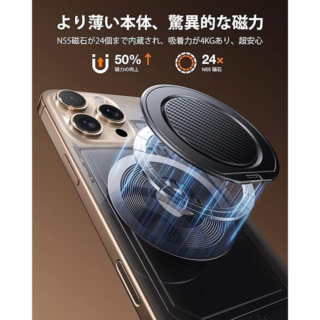 【極薄で吸着力2KGある ・ご安心】マグネットリングを購入する際、磁力が最も気になるポイントではないでしょうか?「MagRing Slim」は、その心配を一気に解消します。なぜなら、Andobilは製品の機能やデザインだけでなく、お客様のスマホの安全性を最優先に考えているからです。「MagRing Slim」は極薄の本体で、業界最強の「N55ネオジウム磁石」を24個まで内蔵され、また、磁石の配置も数万回の最適化を経て、安心できる4KGの驚異的な磁力を実現しました。この超強力な磁力により、スマホリングはスマホにしっかりと吸着し、通勤や旅行、さらにはジョギングやスケートボードの際でも、スマホの落下を心配する必要はありません。「MagRing Slim」を選ぶことは、より安心なライフスタイルを選ぶことです。今すぐ、このリングにある、前例のない安心感を体感して頂ければ嬉しいです。