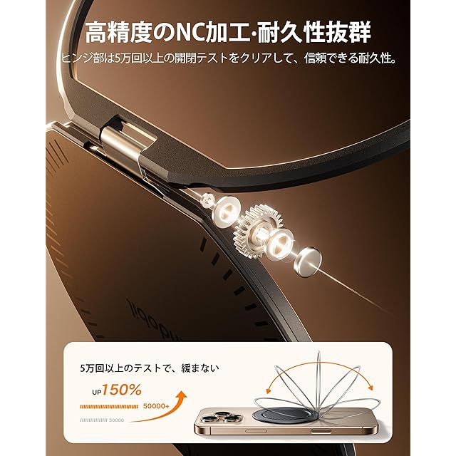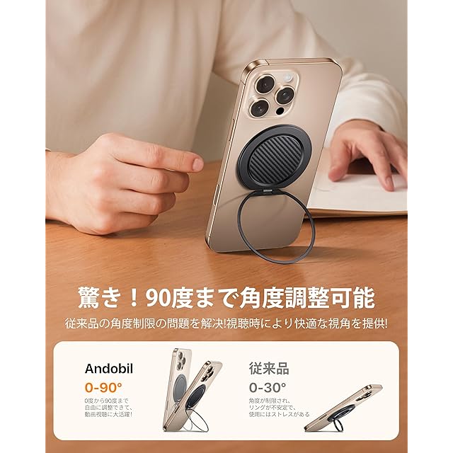 【スタンド機能は超安定 - 90度まで調整可能】市販の携帯リングはほぼスタンド機能が付いていますが、スタンドの角度は0度から30度までに限られていて、最適な角度で動画視聴することができません。より良くスタンド機能を利用する為に、Andobilの「MagRing Slim」は、リングを拡大し、外側に配置して、スタンドの角度が0度から90度まで自由に調整することが可能になります。そのおかげで、動画視聴やビデオ通話、自撮りにより良い快適な視野角でスマホを楽しめます。更に、拡大リングにより、リングとテーブルの接触面積が増大して、スタンドをテーブルに素早くかつ安定して固定できて、小型リングを使う際に頻繁に調整する手間を徹底的に省けました。✨最後に、スマホリングのヒンジ部は高精度のNC加工技術を用いて製造されており、各部品の精密な組み合わせがされています。また、開閉テストを5万回以上をクリアして、スタンド機能が「ガタつく」や「緩くなる」といった問題を一気に解決できました。「Magring slim」を選んで、より自由で快適な生活を楽しんでください!