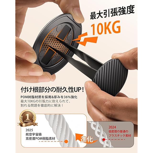 【付け根部分の品質改良·POM樹脂材質採用&厚み36%増強】Andobilは常にユーザーに高品質な製品を提供することを目指しており、2025年に製品改良のためのユーザー意見を収集して、内蔵リングの付け根部分について徹底的な品質改良を実施し、主に2つの改善点があります。第一に、付け根部分の厚みを36%増加させました(ただしスマホリング全体の厚みは変わらないのでご安心ください)。厚みを増すことで構造安定性が向上し、変形や引っ張りによる損傷が起こりにくくなり、製品寿命が延びました。第二に、付け根部分の材質を高密度・高耐久性のPOM樹脂に変更しました。2024年採用の低密度普通プラスチック材質と比べ、新材質は耐久性に優れています。現在、付け根部分部分の引っ張り耐荷重は10kgまで可能で、破損の心配がなく、安心してお買い求めいただけます。