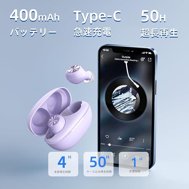 【本体4時間&ケース込み50時間超長再生】本体と充電ケースのバッテリーをアップグレード、より長く使えるようになり、コンパクトなデザインにもかかわらず、イヤホン本体のみで約4時間連続再生でき、400mAhの充電ケース込みで最大約50時間以上超長再生、出張や作業中でもバッテリー切れが起こりにくく安心して使えます。Type‐C急速充電に対応していますので、10分ほどの充電で1時間ぐらい再生できます。