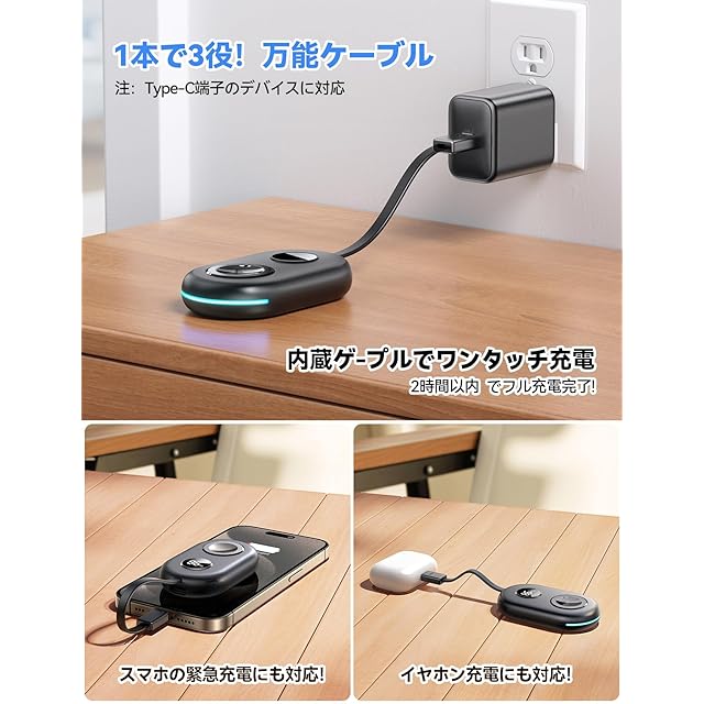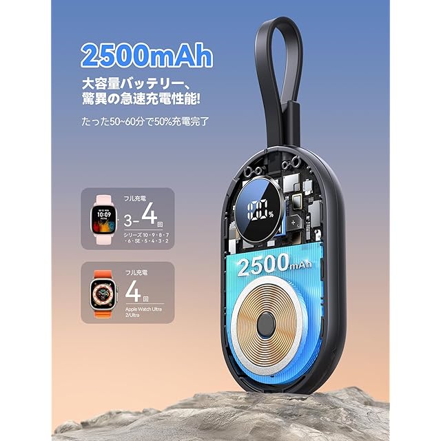 【2in1 USB C充電ケーブル内蔵!キーホルダー収納デザイン!】内蔵のUSB-C入力および出力充電ケーブルの2-in-1設計で、入力はApple Watchモバイルバッテリーの充電に使用し、出力はAirPods ProやUSB-C対応のデバイスの緊急充電に対応します。2台のデバイスを同時に充電できます!ケーブルをモバイルバッテリーに接続してリングを形成し、ケーブルはキーリング収納設計で、バッグに取り付けるのも簡単で、超コンパクトでアウトドアや旅行に便利です。Apple watch 充電器の理想的な選択です!