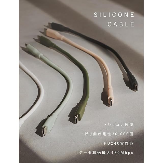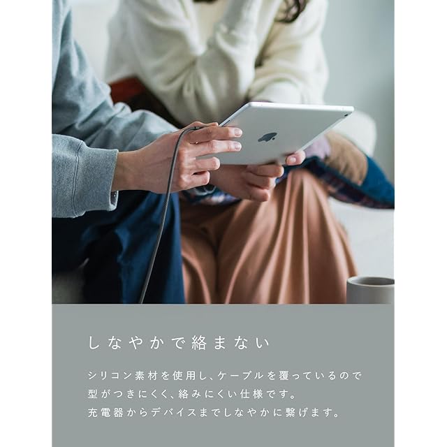 外装にシリコン素材を使用したことで、従来のケーブルにはない柔らかい質感を実現しました。優しい使い心地をご体感ください。カバンやポケットに入れても絡みにくく、出し入れもスムーズに行えます。折り癖や巻き癖が付きにくいため、いつでもストレスフリーにご使用いただけます。