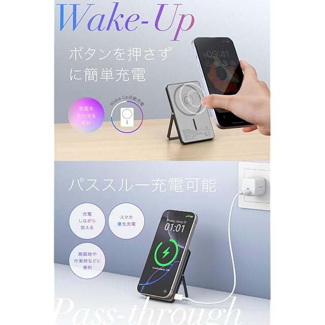 【ボタンを押さずに充電】ワイヤレス充電対応のスマートフォンの背面を合わせるだけで。充電が始まる「Wake-Up」自動充電機能を搭載しています。通常は、充電を開始する場合、モバイルバッテリー側の電源を押す必要があり、ひと手間必要ですが、本製品はワイヤレス充電を検知して自動で出力開始できる「Wake-Up」機能により、スマートな充電が実現しました。充電器として使う場合にも非常に便利な機能となっています。