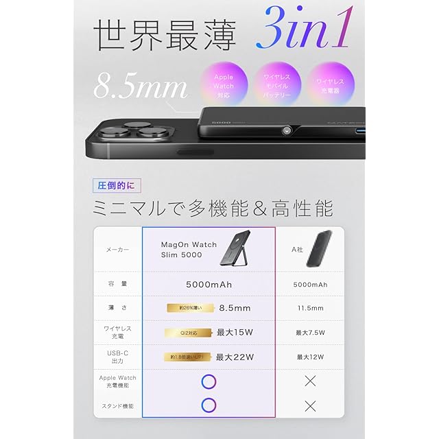 【8.5mm 世界最薄】薄さにこだわり続けるMATECHは、更にApple Watch対応のモバイルバッテリーとして世界最薄を実現しました。8.5mm薄さには妥協しないデザインに加えてApple Watchも充電できる機能が搭載しました。これ1つで、ワイヤレスモバイルバッテリー、ワイヤレス充電器、Apple Watch充電器として活用することができます。
