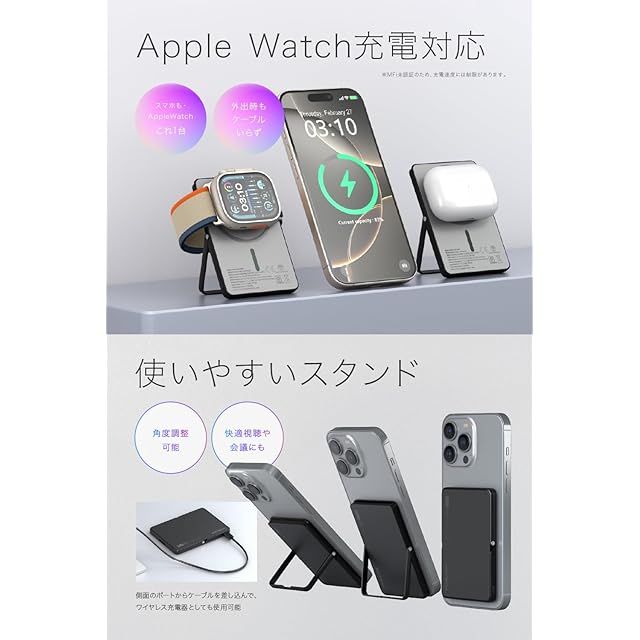 【Apple Watch充電対応】本製品にはApple Watchの充電に対応した専用モジュールを搭載。iPhoneなどのスマートフォンに加え、Apple Watchの充電もこれ一台で行えます。(※MFi未認証のため、充電速度には制限があります)別途Apple Watch用充電器を持ち運ぶ必要がなく、モバイルバッテリー1つでスマートに充電を完結できるため、外出時や旅行時にも大変便利です。