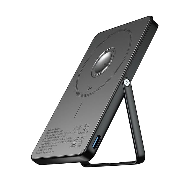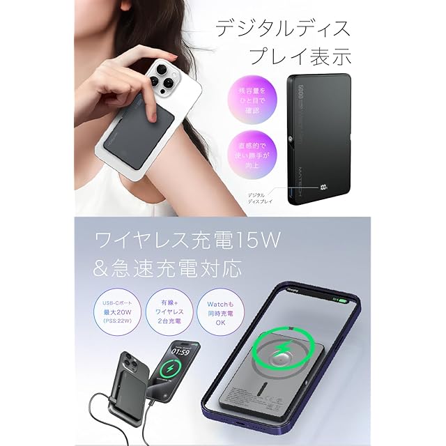 MATECH(マテック)® Qi2 モバイルバッテリー マグセーフ 小型 超薄型 軽量(薄さ8.5mm, 5000mAh)【アップルウォッチ 充電器/MagSafe対応マグネット式/ワイヤレス充電 最大出力15W/タイプC PD22W/iPhone12~16対応】(MagOn Watch Slim 5000 ブラック)