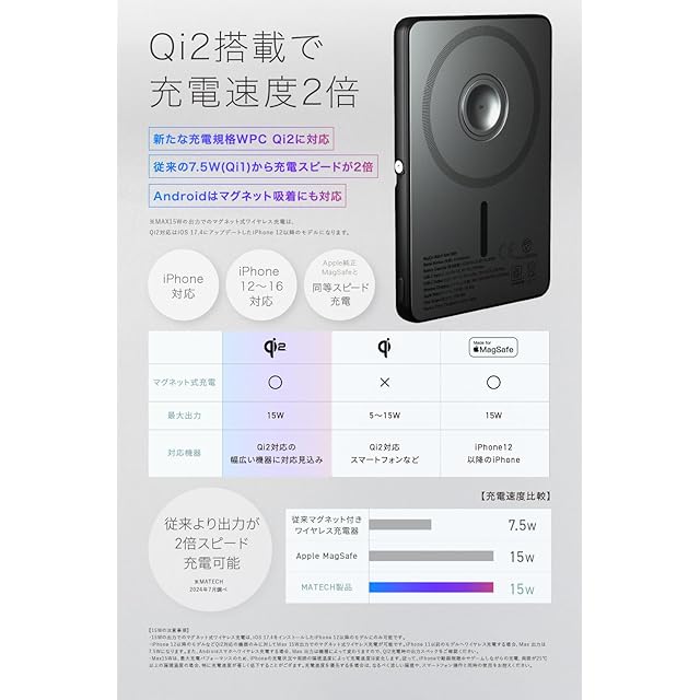 【Qi2搭載で充電速度2倍】新たな充電規格WPC Qi2に対応しました。従来の7.5W(Qi1)から充電スピードが2倍15WでiPhoneを充電することができます。また、Androidの場合は、マグネット吸着にも対応し、ぴたっと、くっついて素早く充電することができます。