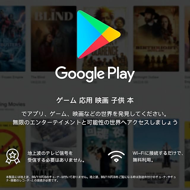 【スマートテレビ チューナーレス】NETFLIX、Prime Video、YouTubeなどのプリインストールアプリに加え、Google Play ではアプリ、ゲーム、映画、音楽などをダウンロードでき、さまざまなコンテンツに簡単にアクセスして楽しむことができます。本機は、テレビ放送チューナー(地上波/BS/CS)を搭載していません。