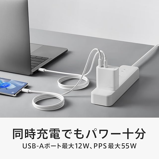 複数デバイス対応/USB-PDのPPS規格で最大55Wに対応し、 ノートPCの充電にもお使いいただけます