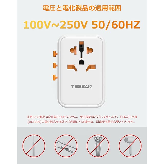 【ご注意】本製品に変圧機能はございませんので、日本国内仕様(AC100V)の電化製品を海外でご利用になる場合は、別途変圧器が必要となります。 また、炊飯器、ヘアドライヤーなどの高出力電化製品は変圧器と併用してご使用いただく必要があります。ご使用の際は必ず電圧をご確認ください。100-250V対応と表記の電化製品は海外仕様電化製品のため、変圧器がなくても使用可能です。(ヒューズの最大負荷電流は10Aで、電圧110Vの国で使用の場合は最大電力110V*10A=1100W以内の電器対応で、250Vの国で使用の場合は最大電力250V*10A=2500W以内の電器を対応します)。