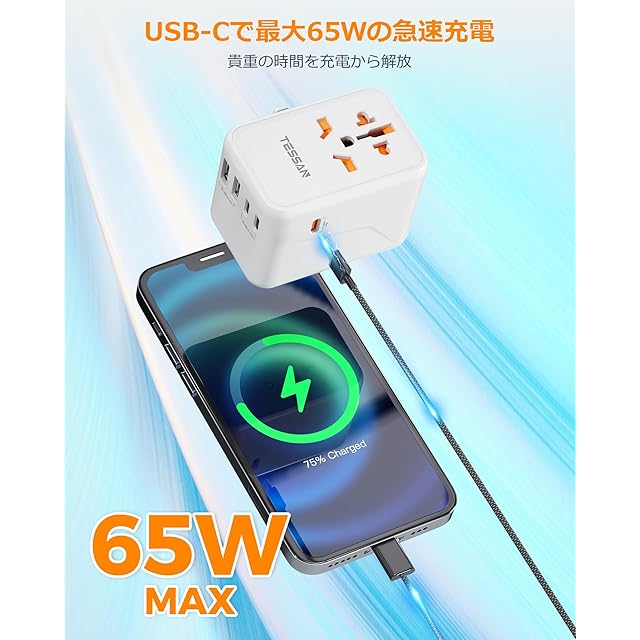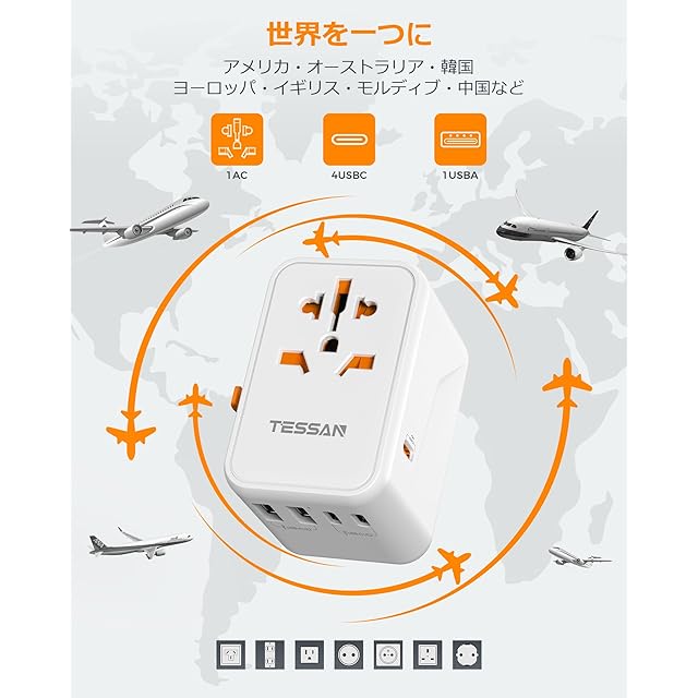 <br>「全世界対応の海外 変換プラグ」<br>TESSANの変換プラグに内蔵した電源ピンはCタイプ、Oタイプ、BFタイプ、Aタイプの4種類の海外 コンセントに対応できます。一度に5台のデバイスを同時に充電可能。また、65Wの出力で急速充電できます。これ1つで韓国、ヨーロッパ、オーストラリア、イギリス、アメリカ、中国、シンガポールなど含め224ヶ国に対応可能です。海外旅行に大変便利です。<br>先進のGaNテクノロジーを採用し、効率性と放熱性を向上させています。あなたの海外旅行や海外出張にもっと気楽で楽しめるように設計されております。