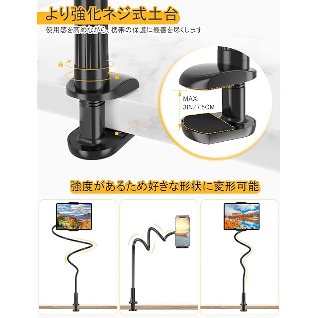 【強化版優れたネジ式台座✧安定感満々】 普通モデルのスマホスタンドは土台のところが弱すぎで壊れ易く、スマホが支えきれなくなる状況が発生いたしましたが、弊店のタブレットスタンドは、土台の厚さを倍にすることで強度が増し、最大75mmまで調節可能です。割れにくくなっており、大荷重に耐えれない問題点を改善しました。又、工具不要で取り付けも簡単です。角度を自由的に調整できるアームスタンドは、様々な高さのニーズに適しています。クランプ部の両側と土台の内側にシリコン滑り止めマットを設けて、安定感が増えるだけではなく、スマホやタブレットや家具を傷からきちんと守ります。