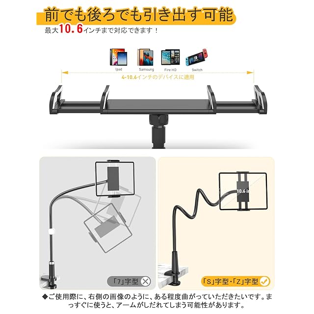 【最大10.6インチiPadまで✧多機種兼用】 弊社のタブレットスタンドのクランプは、前のクランプサイズより改善され、クランプが全長19.5cmになり、設備を受ける部分は広くなり、前でも後ろでも引き出す可能になります。最大10.6インチiPadまでを置いても安定しています。スマホをより快適に置くことができ、スマホ/タブレットをクランプに入れも取り出しも簡単です。改善されたスタンドのデザインが4-10.6インチのスマホ&タブレット&任天堂等機種に適用。さらに、ケースを付けている状態も利用可能です。動画鑑賞、ゲームで様々な場合でもっと役立ちます。※指を誤って挟んでしまう可能性があり、お子様だけでは使わせないようにしてください。
