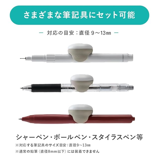 対応する筆記具 シャーペン・ボールペン・スタイラスペン等 ※対応する筆記具のサイズ目安:直径9~13㎜ ※通常の鉛筆(直径8mm以下)には装着できません