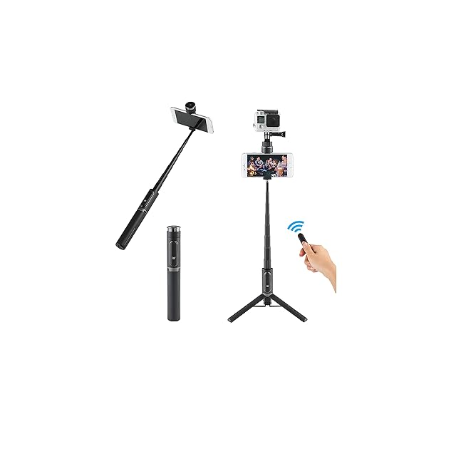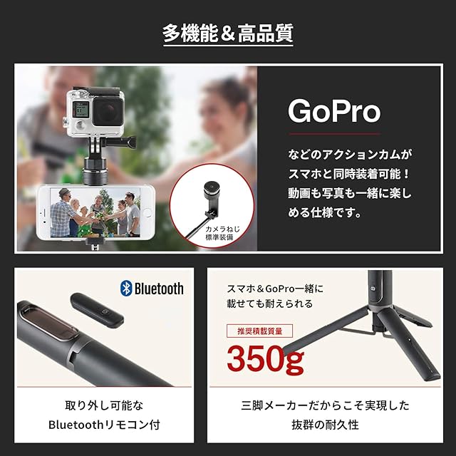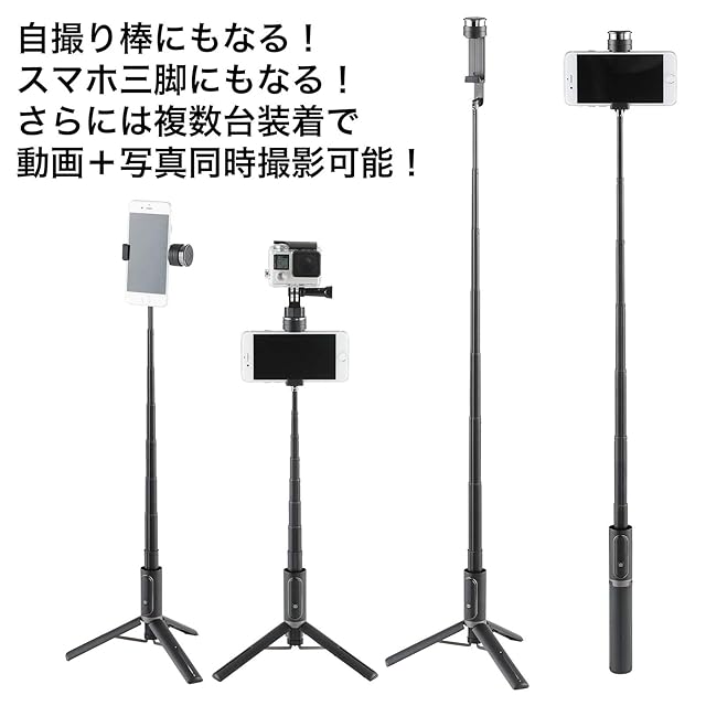 シャッターボタン付き自撮り棒が便利なスマホ三脚に大変身、先端にカメラねじ装備で2台撮影も可能。