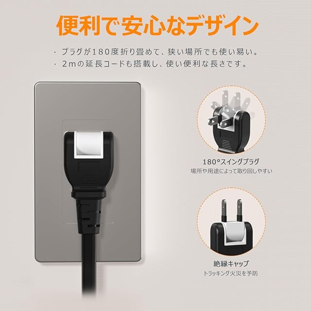 【延長コード 2メートル usb コンセント】このusb コンセントタップの本体は耐熱性に優れたABS 94V0樹脂で作られて、電気火災の防止に有効です。また、180°スイングプラグを採用していて、狭い場所でも配線しやすいです。プラグの根本に絶縁キャップが付いて、万一の発熱の際にも融解しにくいです。なお、延長コードは2メートルで、少し遠い場所での給電もできます。