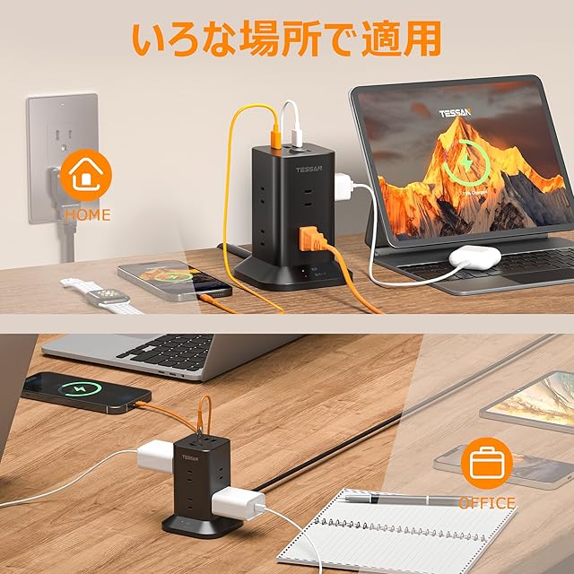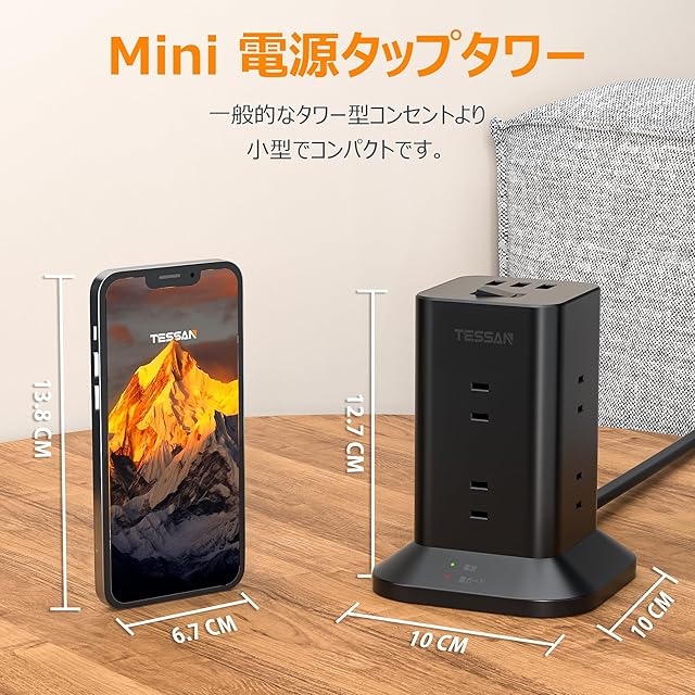 【 一台11役のタワー型電源タップ】これは8個のACコンセントと3個のUSB-Aポートを搭載しているUSB タワー型電源タップです。8個AC コンセント口の間隔が広くて、大きいACアダプタでもすっきり接続できます。三つのUSBポートにはスマートICを内蔵して、最適の電流を提供します。なお、僅か10x10x12.7cmのサイズで、650gの重量で、一般的なタワー型コンセントより小型で軽量で、持ち運びに便利です。